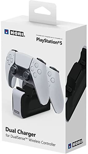 Simultaneously charge two controllers with the HORI Dual Charger for DualSense Wireless Controller. Easily charge controllers by simply placing them on the charger! Know the charging status of a controller with a glance. Built-in LEDs indicate charging with red and a charge completed with green. Charger connects to the console via USB. Compatible with DualSense Wireless Controllers. (Wireless DUALSHOCK4, Wireless DUALSHOCK3, and Wireless SIXAXIS controller are not compatible.) Charge two controllers simultaneously Battery Life: up to 20 hours per full charge* Compatible with DualSense Wireless Controllers LED indicators display charge status Powered via USB