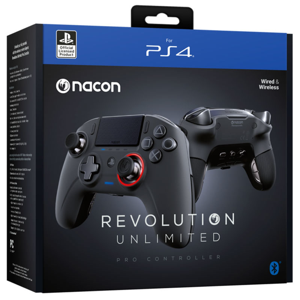 Unleash your full potential with the wireless or wired esports revolution unlimited pro controller.Works with a bluetooth receiver offering high performance gameplay with the audio chat featureIncludes a rechargeable li-polymer 1300 mah battery (autonomy 7h)Wireless and wired connectionsAudio & chat support in wireless and wired modesDual customisable* sticks with 30/38/46 amplitudeInterchangeable stick headsSmart led indicators3.5mm headset jack (headset not included)On board headset microphone and volume controls3m braided usb-c detachable cable, transfer data + charge4x configurable shortcut buttons4* or 8-way directional padLED player status indicator2x customisable* vibration motorsInternal weight compartments (2x10g, 2x14g, 2x16g)Hard storage caseJump straight into the action in ps4™ mode, or take your play further with fully customisable profiles in advanced mode1. PS4 modePlug & play functionality with integrated dualshock®4 controls**Enhanced dual stick control with 46 amplitudeManually customise the 4x shortcuts buttons2. PS4 advanced modeInstantly switch between 4x pre-loaded custom profiles to suit a range of gamesModify or replace those profiles with 4x of your own (via the upgraded pc/mac companion app*):Adjust the response curve of each stickReverse y-axis of your sticksReverse your left and right sticksAdjust the sensitivity and dead-band of each triggerIndependently adjust the vibration intensity on the left and right hand gripsChange the right stick light for a custom look3. PC advanced mode****Windows® 7/8/1o pc or mac and internet connection required, registration required to download the software.**Light bar and speaker are not included or available.***PC advanced mode not tested nor endorsed by sony interactive entertainment europe.