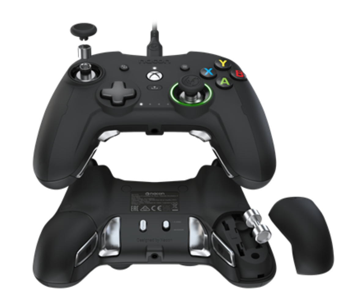 The revolution continues on Xbox One and Xbox Series X and PC! The Revolution family of controllers expands and welcomes its first model designed for Xbox. Fully customizable and optimized for competitive gaming on Xbox and PC consoles, the entire NACON experience in professional controllers is present in the Revolution X. With free and comprehensive software for creating profiles, a carrying case, accessories for the sticks and additional weights , will attract the most demanding players.4 shortcut keys, configurable manually or via software *2 joysticks (ALPS) with 44 to 30 ? amplitudeAccessories: 6 additional weights, 6 stick shafts for angle adjustment, 6 stick heads, transport bagStandard profile or extended profile with the app * Revolution X (Microsoft Store):Creation of personalized profiles (4 profiles can be saved in the controller)Comprehensive settings for the joysticks & trigger buttonsD-pad with 4 or 8 waysCustomizable RGB lighting effects and Vibration motors3.5 mm headset connection for audio and chat (headset not included)With access to Dolby Atmos? * (headset required)3 m detachable USB-C braided cable (included)