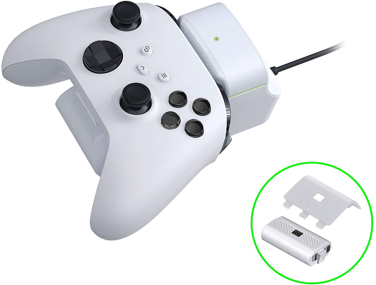 Xbox Series S White Charging Dock – Easy drop and charge system1 x 700mAh rechargeable NiMH battery packLED charging status indicatorPowered by fixed USB cable (1.2M)Replacement battery cover included
